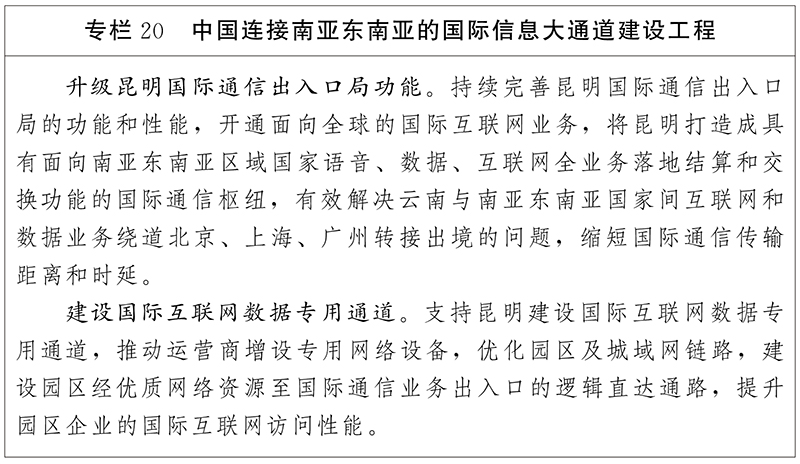 加強信息基礎設施互聯(lián)互通。建設中國連接南亞東南亞的國際信息大通道,加快推動跨境通信光纜建設,持續(xù)擴容中緬、中老跨境光纜,推動建設中越河口—老街跨境國際通信線路。緊抓云南建設我國面向南亞東南亞輻射中心的機遇,積極推動昆明國際通信出入口局從語音、數(shù)據專線和互聯(lián)網轉接業(yè)務向全業(yè)務升級,著力推動昆明國際互聯(lián)網數(shù)據專用通道建設,提升國際通信服務能力,促進外向型產業(yè)集聚。