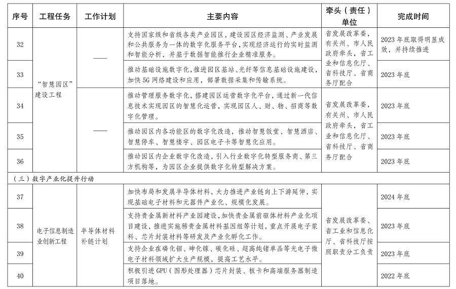 ——數(shù)字經(jīng)濟(jì)園區(qū)提檔升級(jí)。圍繞數(shù)字產(chǎn)品制造業(yè)、軟件和信息技術(shù)服務(wù)業(yè)、新一代信息技術(shù)產(chǎn)業(yè)等,創(chuàng)建5個(gè)以上省級(jí)數(shù)字經(jīng)濟(jì)園區(qū),形成差異發(fā)展、帶動(dòng)效應(yīng)顯著的數(shù)字經(jīng)濟(jì)核心產(chǎn)業(yè)集聚區(qū)。