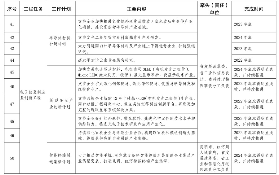半導(dǎo)體材料補(bǔ)鏈計(jì)劃。依托優(yōu)勢(shì)企業(yè),加快布局和發(fā)展半導(dǎo)體材料,大力推進(jìn)產(chǎn)業(yè)鏈向上下游延伸,實(shí)現(xiàn)基礎(chǔ)電子材料和元器件產(chǎn)業(yè)化、規(guī)?;l(fā)展。支持貴金屬新材料產(chǎn)業(yè)園建設(shè),加快貴金屬前驅(qū)體材料產(chǎn)業(yè)化項(xiàng)目建設(shè),推進(jìn)實(shí)施稀貴金屬材料基因組等計(jì)劃,重點(diǎn)開展電子漿料、芯片封裝材料等研發(fā)及產(chǎn)業(yè)化孵化工作。支持企業(yè)在磷化銦、砷化鎵、碳化硅、超高純鍺單晶等光電子微電子材料領(lǐng)域擴(kuò)大生產(chǎn)規(guī)模,提高工藝水平。積極引進(jìn)GPU(圖形處理器)芯片封裝、板卡和高端服務(wù)器制造項(xiàng)目落地。支持企業(yè)加快推進(jìn)氮化鎵外延片及微波/毫米波功率器件產(chǎn)業(yè)化項(xiàng)目,建設(shè)寬禁帶半導(dǎo)體產(chǎn)業(yè)基地。支持發(fā)光二極管藍(lán)寶石襯底基片生產(chǎn)及研發(fā)。大力引進(jìn)國內(nèi)外半導(dǎo)體材料及產(chǎn)業(yè)鏈上下游優(yōu)勢(shì)企業(yè),補(bǔ)鏈強(qiáng)鏈延鏈,全面提升產(chǎn)業(yè)韌性。高水平建設(shè)云南貴金屬實(shí)驗(yàn)室,聚焦稀貴金屬新材料領(lǐng)域突破關(guān)鍵核心技術(shù)瓶頸,打造引領(lǐng)性技術(shù)及產(chǎn)業(yè)。