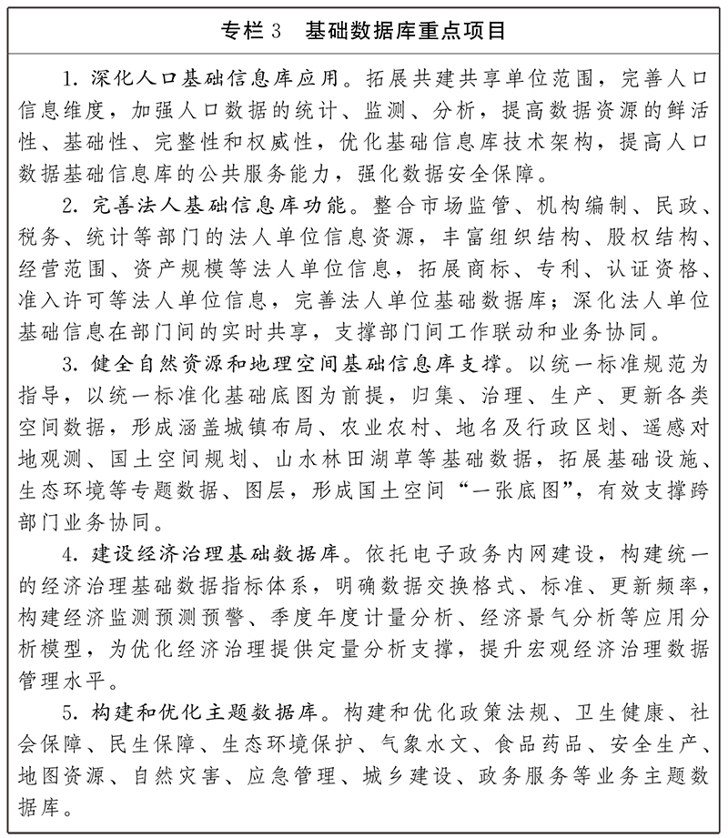 1.建立健全基礎(chǔ)數(shù)據(jù)庫。升級完善人口、法人、自然資源與地理空間和電子證照等基礎(chǔ)信息資源庫,建立健全經(jīng)濟(jì)治理基礎(chǔ)數(shù)據(jù)庫,建立基礎(chǔ)數(shù)據(jù)更新聯(lián)動運(yùn)維機(jī)制,根據(jù)典型應(yīng)用場景推進(jìn)基礎(chǔ)數(shù)據(jù)的標(biāo)簽化、主題化管理,開發(fā)高頻需求數(shù)據(jù)的共享服務(wù)接口,強(qiáng)化數(shù)據(jù)質(zhì)量管理和融合應(yīng)用,不斷提升基礎(chǔ)數(shù)據(jù)庫建設(shè)水平。圍繞商事制度改革和產(chǎn)業(yè)發(fā)展需要,增加自然人、企業(yè)等網(wǎng)絡(luò)經(jīng)營主體基礎(chǔ)信息,整合到法人單位基礎(chǔ)信息庫。