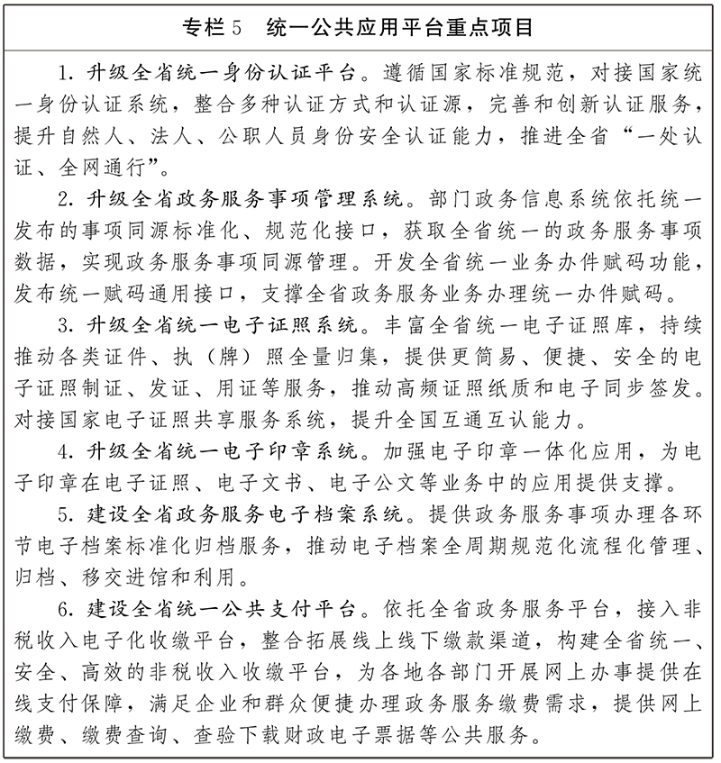 基礎(chǔ)支撐能力不斷夯實(shí)。持續(xù)提升電子政務(wù)網(wǎng)絡(luò)覆蓋度和承載力,有力保障全省政務(wù)信息化應(yīng)用穩(wěn)定、高效、安全運(yùn)行。建成全省統(tǒng)一政務(wù)云,省級非涉密政務(wù)信息系統(tǒng)上云率達(dá)到90%以上。建成全省統(tǒng)建共用的公共應(yīng)用平臺,電子證照出證率和電子印章加蓋率達(dá)到80%以上。