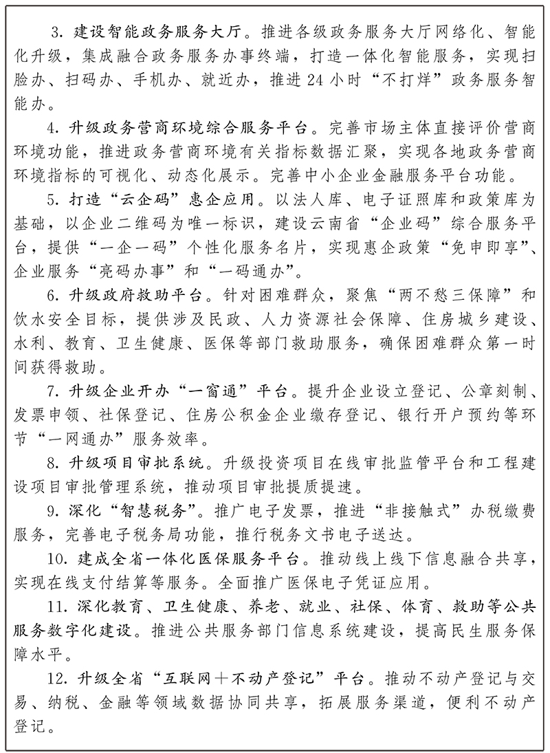 1.打造政務(wù)服務(wù)總門戶,深化政務(wù)服務(wù)“網(wǎng)上辦”。持續(xù)升級全省政務(wù)服務(wù)平臺。持續(xù)優(yōu)化云南政務(wù)服務(wù)網(wǎng),統(tǒng)一互聯(lián)網(wǎng)辦事入口,全面實(shí)現(xiàn)“只進(jìn)一張網(wǎng)、能辦所有事”。升級統(tǒng)一申辦受理、業(yè)務(wù)辦理、行政審批中介服務(wù)等業(yè)務(wù)系統(tǒng)。完善政務(wù)服務(wù)“好差評”系統(tǒng),推動線上線下評價全渠道接入。推進(jìn)部門業(yè)務(wù)系統(tǒng)改造并接入全省政務(wù)服務(wù)平臺。推動業(yè)務(wù)流程再造,升級“一件事一次辦”主題集成服務(wù)系統(tǒng),提升以自然人和法人為中心的全生命周期事項關(guān)聯(lián)辦理水平。運(yùn)用人工智能、數(shù)據(jù)圖譜等技術(shù),采取智能證照核驗(yàn)、智能輔助審查等手段,輔助人工審批,積極推進(jìn)“智慧辦事”和“智能審批”。