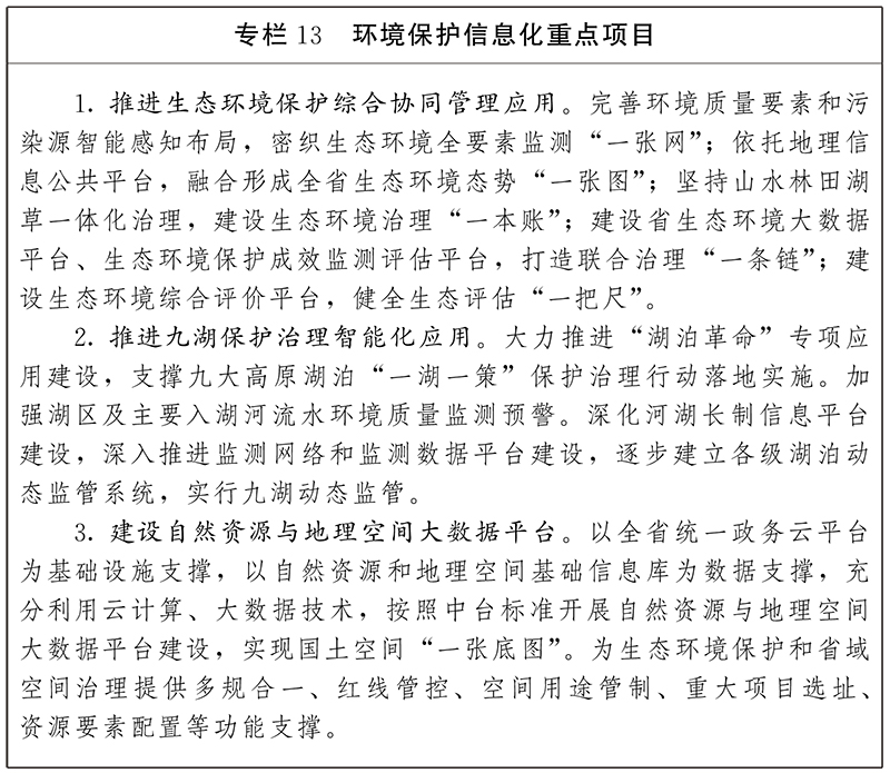 1.加強(qiáng)生態(tài)環(huán)境保護(hù)數(shù)字化應(yīng)用。以地理信息公共服務(wù)平臺為支撐,加強(qiáng)衛(wèi)星遙感、無人機(jī)、視頻監(jiān)控、傳感器“四位一體”綜合應(yīng)用,完善生態(tài)環(huán)境監(jiān)測網(wǎng)絡(luò),優(yōu)化監(jiān)測點(diǎn)位布局,廣泛開展生態(tài)監(jiān)測物聯(lián)網(wǎng)應(yīng)用。充分利用大數(shù)據(jù)等手段整合與挖掘生態(tài)環(huán)境監(jiān)測數(shù)據(jù)資源,提升區(qū)域大氣污染防治、流域污染防治、土壤污染防治等決策能力,構(gòu)建生態(tài)環(huán)境綜合管理信息化平臺。構(gòu)建重點(diǎn)江河湖泊治理數(shù)字化平臺,匯集生態(tài)環(huán)境、水利、自然資源等部門的基礎(chǔ)數(shù)據(jù),重點(diǎn)建設(shè)智能感知、數(shù)據(jù)匯集、綜合應(yīng)用、多維展示、決策支撐等系統(tǒng)。