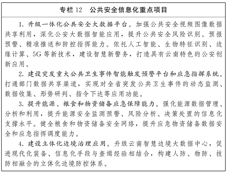 2.加強(qiáng)社會治安數(shù)字化應(yīng)用。推動數(shù)字技術(shù)在法院、檢察院和司法行政、公安等部門的深度運(yùn)用,打通辦案平臺,實(shí)現(xiàn)全流程網(wǎng)上“輕快”、“便捷”辦案。健全信息化社會治安防控體系,實(shí)現(xiàn)預(yù)測預(yù)警預(yù)防。推進(jìn)“雪亮工程”建設(shè),整合各類視頻監(jiān)控資源,加大在維穩(wěn)、反恐、打擊犯罪等公共安全防范領(lǐng)域的綜合應(yīng)用,提升防范化解社會風(fēng)險的能力和水平。加快部署智能感知、信息采集等基礎(chǔ)設(shè)施,構(gòu)建邊境管控數(shù)字防控網(wǎng),推進(jìn)邊境管控數(shù)字化應(yīng)用,開展邊境車輛、人員大數(shù)據(jù)分析研判,提升邊境管控指揮系統(tǒng)可視化、數(shù)字化、智能化水平。