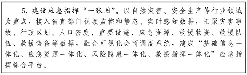 3.構(gòu)建數(shù)字應(yīng)急體系。聚焦地震、地質(zhì)災(zāi)害、森林草原火災(zāi)、洪澇、干旱、氣象等自然災(zāi)害,以及危險化學(xué)品、煙花爆竹、礦山、道路交通、民爆、消防、旅游景點(diǎn)等安全領(lǐng)域,推進(jìn)應(yīng)急指揮信息網(wǎng)絡(luò)和感知網(wǎng)絡(luò)建設(shè)、現(xiàn)場救援裝備和應(yīng)急資源數(shù)據(jù)匯聚建設(shè)、風(fēng)險隱患監(jiān)測預(yù)警和監(jiān)管執(zhí)法建設(shè),實(shí)現(xiàn)應(yīng)急指揮“一張圖”綜合管理,提高風(fēng)險防控和突發(fā)災(zāi)害事故應(yīng)急處置能力。