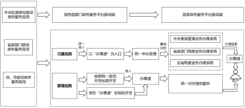 “辦事通”作為全省移動政務(wù)服務(wù)的主要提供渠道和總?cè)肟?,與其他省、區(qū)、市政務(wù)服務(wù)平臺移動端、國務(wù)院部門政務(wù)服務(wù)平臺移動端和國家政務(wù)服務(wù)平臺移動端共同構(gòu)成全國一體化政務(wù)服務(wù)平臺移動端。各地各部門原則上不再新建獨立對外服務(wù)的移動政務(wù)服務(wù)應(yīng)用,應(yīng)依托“辦事通”統(tǒng)一對外提供移動政務(wù)服務(wù);已建成的各類移動政務(wù)服務(wù)應(yīng)用,要按照統(tǒng)一標(biāo)準(zhǔn)規(guī)范和“應(yīng)接盡接”、“應(yīng)上盡上”原則統(tǒng)籌整合并接入“辦事通”。(層級架構(gòu)見附件1)