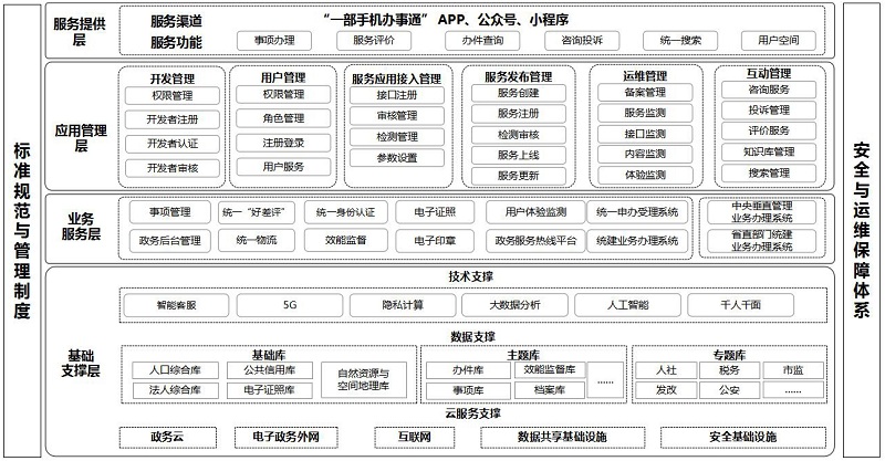 “辦事通”技術(shù)架構(gòu)主要包括基礎(chǔ)支撐層、業(yè)務(wù)服務(wù)層、應(yīng)用管理層、服務(wù)提供層?;A(chǔ)支撐層提供基礎(chǔ)數(shù)據(jù)庫、數(shù)據(jù)共享、安全基礎(chǔ)設(shè)施以及云計算、大數(shù)據(jù)分析等基礎(chǔ)支撐。業(yè)務(wù)服務(wù)層提供統(tǒng)一事項管理、統(tǒng)一身份認(rèn)證、統(tǒng)一申辦受理、統(tǒng)一電子證照、統(tǒng)一電子印章等公共支撐。應(yīng)用管理層部署移動政務(wù)服務(wù)應(yīng)用管理系統(tǒng),提供開發(fā)管理、用戶管理、服務(wù)應(yīng)用接入管理、服務(wù)發(fā)布管理、運維管理、互動管理等功能,實現(xiàn)對移動政務(wù)服務(wù)應(yīng)用的規(guī)范管理和運行監(jiān)測。服務(wù)提供層通過移動APP、小程序等服務(wù)渠道,按照統(tǒng)一標(biāo)準(zhǔn),面向企業(yè)和群眾提供政務(wù)服務(wù)事項咨詢、辦理、查詢、評價等服務(wù)。(技術(shù)架構(gòu)見附件2)