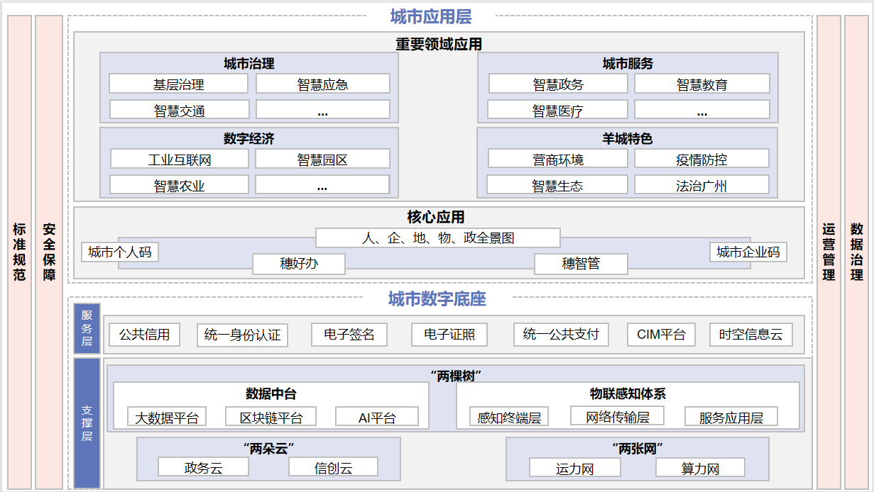 建成政務(wù)云服務(wù)平臺(tái)、政務(wù)網(wǎng)、大數(shù)據(jù)中心、基于“四標(biāo)四實(shí)”數(shù)據(jù)的數(shù)字廣州基礎(chǔ)應(yīng)用平臺(tái)等政務(wù)信息化公共支撐平臺(tái)。截至2020年12月31日,市政務(wù)云服務(wù)平臺(tái)共有2200多臺(tái)物理服務(wù)器及12000多臺(tái)虛擬服務(wù)器,存儲(chǔ)總量超過(guò)16300TB,提供58項(xiàng)云資源服務(wù),80%以上市級(jí)單位在云服務(wù)平臺(tái)部署應(yīng)用系統(tǒng);市電子政務(wù)網(wǎng)實(shí)現(xiàn)五大核心帶寬80G互聯(lián),各區(qū)實(shí)現(xiàn)萬(wàn)兆互聯(lián),共接入1000余家用戶單位,其中互聯(lián)網(wǎng)訪問(wèn)單位400余家;建成城市二維地圖和CIM(城市信息模型)25平臺(tái),依托政務(wù)大數(shù)據(jù)應(yīng)用開(kāi)展城市治理工作;城市網(wǎng)絡(luò)通信能力及網(wǎng)絡(luò)安全水平顯著提升,數(shù)據(jù)信息保密安全監(jiān)管體系逐步完善,智慧城市數(shù)字底座安全穩(wěn)固,信息基礎(chǔ)設(shè)施建設(shè)位居全國(guó)前列。