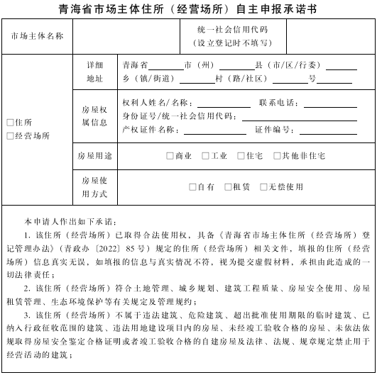 附件:1.青海省市場(chǎng)主體住所(經(jīng)營場(chǎng)所)自主申報(bào)承諾書式樣及填寫說明