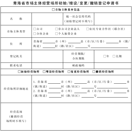 1.《青海省市場(chǎng)主體經(jīng)營場(chǎng)所初始/增設(shè)/變更/撤銷登記申請(qǐng)書》。