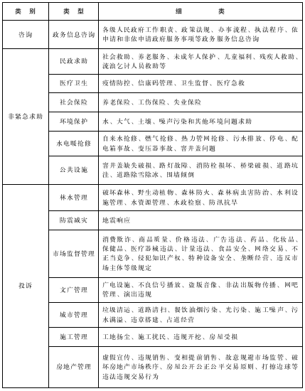(2)涉及經(jīng)濟社會發(fā)展、經(jīng)濟調(diào)節(jié)、市場監(jiān)管、社會管理、城市建設(shè)、城市管理、房地產(chǎn)管理、公共服務(wù)、公共衛(wèi)生、生態(tài)環(huán)境、交通運輸、勞動保障、價格爭議、消費維權(quán)等方面的咨詢、非緊急求助、投訴、舉報和意見建議。