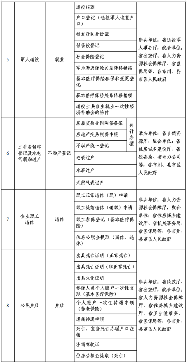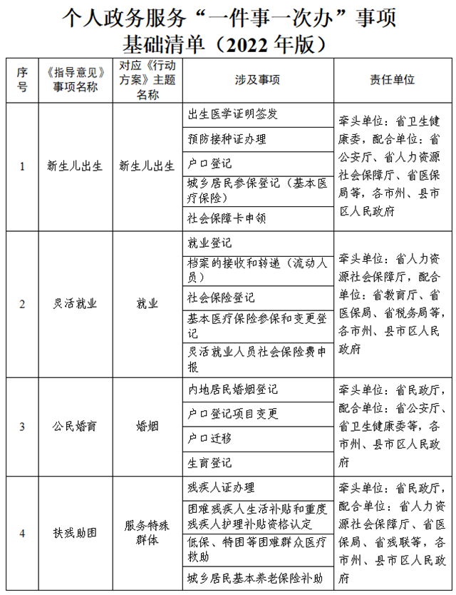 一、梳理明確“一件事”。將《指導意見》“一件事一次辦”事項基礎清單與《行動方案》所部署的26個主題式、套餐式場景應用(以下稱主題)結合起來落實并做適當調整,明確牽頭單位和配合單位。如將《指導意見》事項基礎清單中的“企業(yè)開辦”“企業(yè)準營”事項納入《行動方案》中的“企業(yè)開辦”主題,將“企業(yè)簡易注銷”事項納入“企業(yè)注銷”主題(詳見附件)。將《行動方案》要求在2023年底前完成的“員工保障”“就業(yè)”“婚姻”“身后”等4個主題提前至2022年底前完成。鼓勵各地結合實際拓展本地區(qū)“一件事一次辦”事項范圍。