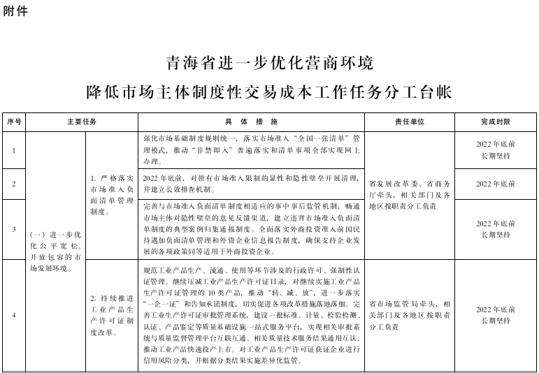 附件:青海省進一步優(yōu)化營商環(huán)境降低市場主體制度性交易成本工作任務(wù)分工臺帳