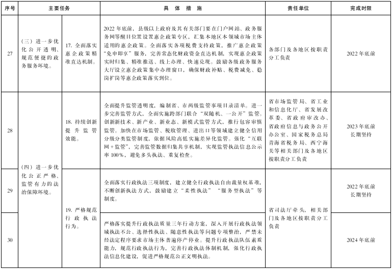 (二十四)強化營商環(huán)境法治保障。全面實施《青海省優(yōu)化營商環(huán)境條例》,不斷完善相關(guān)配套措施。健全優(yōu)化營商環(huán)境“1+N”政策體系,鼓勵各地結(jié)合實際迭代升級本地區(qū)營商環(huán)境綜合性改革措施。聚焦重點領(lǐng)域和關(guān)鍵環(huán)節(jié),持續(xù)開展營商環(huán)境突出問題整治,著力打通政策落地“最后一公里”。(省發(fā)展改革委、省司法廳牽頭,相關(guān)部門及各地區(qū)按職責分工負責)