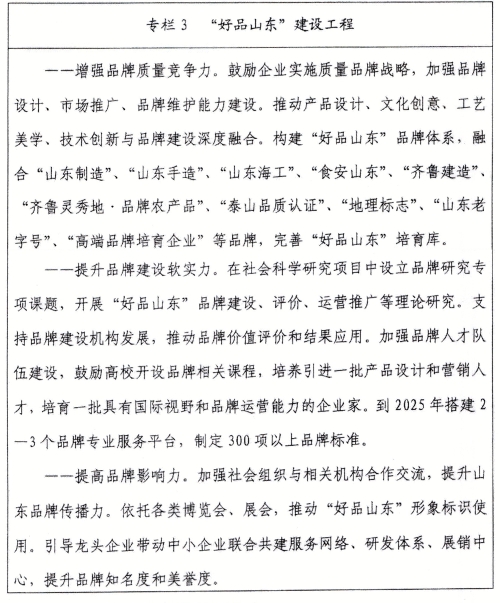 ?。ㄊ┨嵘放浦?。支持企業(yè)實施品牌戰(zhàn)略,提高品牌運營能力,打造一批高端品牌。宣講山東品牌故事,傳播山東品牌文化,增強消費者對“好客山東 好品山東”的品牌認同。建立企業(yè)自我保護、行政保護、司法保護三位一體的品牌保護體系,嚴厲打擊品牌仿冒、商標侵權等違法行為,為品牌發(fā)展創(chuàng)造良好環(huán)境。