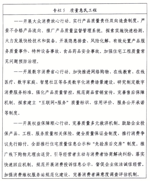 ?。ǘ┘訌娰|量法治建設。加強質量領域地方立法,構建系統(tǒng)完備、科學規(guī)范、運行有效的質量制度體系。推進綜合執(zhí)法部門聯(lián)動,形成統(tǒng)一指揮、橫向協(xié)作、縱向協(xié)同的監(jiān)管執(zhí)法機制,深化行政執(zhí)法與刑事司法銜接,嚴厲打擊制售假冒偽劣商品、侵犯知識產權、工程質量違法違規(guī)等行為。健全產品和服務質量擔保與爭議處理機制,推行第三方質量爭議仲裁。支持開展質量公益訴訟和集體訴訟,嚴格執(zhí)行商品質量懲罰性賠償制度。加強質量法治宣傳教育,普及質量法律知識,營造尊法學法守法用法的良好社會氛圍。