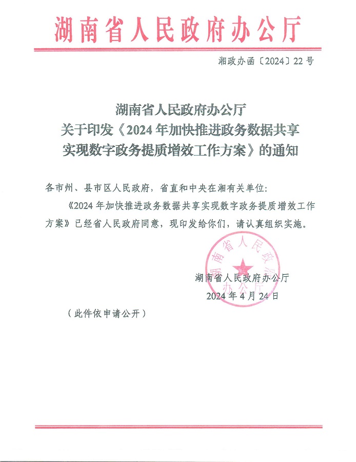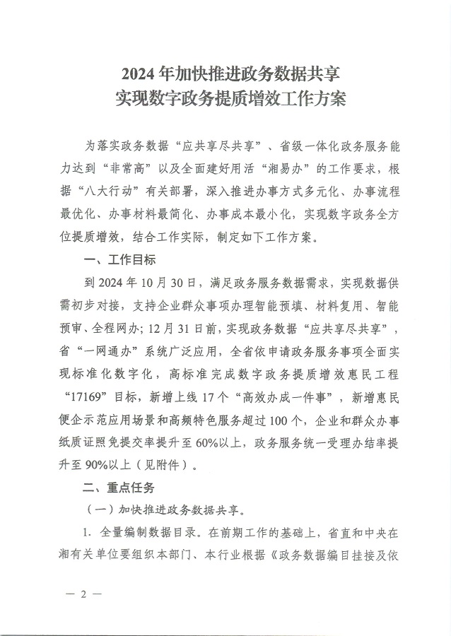 湖南省人民政府辦公廳關(guān)于印發(fā)〈2024年加快推進(jìn)政務(wù)數(shù)據(jù)共享實(shí)現(xiàn)數(shù)字政務(wù)提質(zhì)增效工作方案〉的通知