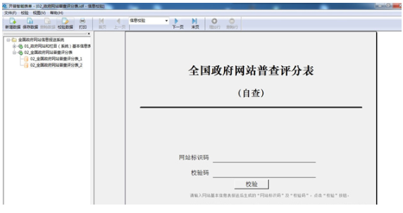填報(bào)單位打開客戶端軟件,選取“全國政府網(wǎng)站普查評分表”并新建數(shù)據(jù),首先輸入“網(wǎng)站標(biāo)識碼”和“校驗(yàn)碼”,通過驗(yàn)證后,填寫該網(wǎng)站的自查評分信息并保存。