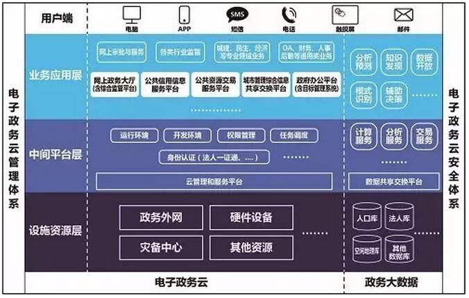 市級云架構(gòu):由設(shè)施資源層、中間平臺層、業(yè)務(wù)應(yīng)用層組成,在政務(wù)云管理體系和安全體系保障下,通過各類用戶終端,為政府內(nèi)部提供統(tǒng)一信息化支撐,向社會公眾提供高效外部服務(wù)。(圖2)