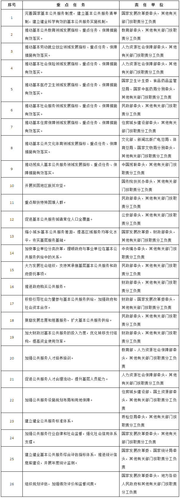 ——國(guó)務(wù)院各有關(guān)部門要按照職責(zé)分工,做好行業(yè)發(fā)展規(guī)劃、專項(xiàng)建設(shè)規(guī)劃與本規(guī)劃的銜接,明確工作責(zé)任和進(jìn)度安排,推動(dòng)各領(lǐng)域重點(diǎn)任務(wù)、保障措施和《清單》項(xiàng)目有效落實(shí)。要加強(qiáng)部門間統(tǒng)籌協(xié)調(diào),共同研究推動(dòng)解決基本公共服務(wù)均等化工作中跨部門、跨行業(yè)、跨區(qū)域及政策創(chuàng)新等重大問(wèn)題。