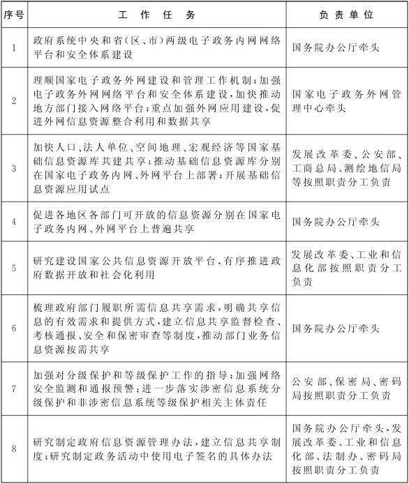 ?。ㄎ澹┩七M(jìn)信息資源共享共用和數(shù)據(jù)開放利用。促進(jìn)各地區(qū)各部門可開放的信息資源分別在國(guó)家電子政務(wù)內(nèi)網(wǎng)、外網(wǎng)平臺(tái)上普遍共享;研究建設(shè)國(guó)家公共信息資源開放平臺(tái),有序推進(jìn)政府?dāng)?shù)據(jù)開放和社會(huì)化利用;對(duì)于涉及國(guó)家安全、商業(yè)秘密、個(gè)人隱私等不宜開放的業(yè)務(wù)信息,政府部門按照職責(zé)分工,梳理履職所需信息共享需求,明確共享信息的有效需求和提供方式,逐步建立信息共享監(jiān)督檢查、考核通報(bào)、安全和保密審查等制度,推動(dòng)部門信息資源按需共享。