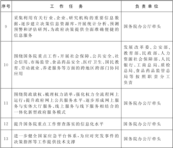 ?。ㄒ唬┨岣邲Q策信息服務(wù)水平。圍繞國(guó)務(wù)院決策需要,以建設(shè)決策支持信息系統(tǒng)為抓手,充分整合各地區(qū)各部門現(xiàn)有辦公應(yīng)用和業(yè)務(wù)系統(tǒng)信息資源,采集利用有關(guān)行業(yè)、企業(yè)、研究機(jī)構(gòu)的重要信息數(shù)據(jù),逐步建立支撐領(lǐng)導(dǎo)決策研判的決策信息資源庫(kù),提供更加及時(shí)高效的信息獲取方式,豐富展現(xiàn)形式,為政府決策提供全面準(zhǔn)確便捷的信息服務(wù)。充分利用職能部門各類專業(yè)系統(tǒng)和智能分析模型,開展統(tǒng)計(jì)分析、預(yù)測(cè)預(yù)警和評(píng)估研判,使國(guó)務(wù)院領(lǐng)導(dǎo)同志能夠及時(shí)掌握經(jīng)濟(jì)運(yùn)行與社會(huì)發(fā)展的實(shí)際狀況和發(fā)展趨勢(shì),不斷提升信息保障和輔助決策能力。