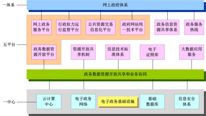 為解決當前政府數(shù)據(jù)開放程度不高,信息共享和業(yè)務(wù)協(xié)同難的問題,利用互聯(lián)網(wǎng)、大數(shù)據(jù)、云計算技術(shù)發(fā)展“互聯(lián)網(wǎng)+政務(wù)服務(wù)”,是提升政府行政效能,提高群眾辦事便捷程度,加強行政效能在線監(jiān)察的有效舉措。發(fā)展“互聯(lián)網(wǎng)+政務(wù)服務(wù)”要圍繞打造“一體系、一中心、五平臺”來進行?!耙惑w系”即網(wǎng)上政府體系,“一中心”即政務(wù)云計算中心,“五平臺”即網(wǎng)上政務(wù)服務(wù)平臺、行政權(quán)力運行監(jiān)管平臺、公共資源交易信息化平臺、政府網(wǎng)站統(tǒng)一技術(shù)平臺、政務(wù)數(shù)據(jù)資源開放平臺。整個“互聯(lián)網(wǎng)+政務(wù)服務(wù)”體系建設(shè)框架如圖3所示。