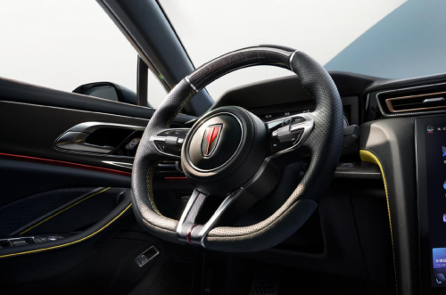 碳纖維加真皮材質(zhì)的平底式方向盤,在釋放腿部空間的同時,也使得視覺中心上移,讓駕駛者更專注于駕駛。六點鐘位置輻條的紋理設(shè)計,細(xì)節(jié)之處見真章。