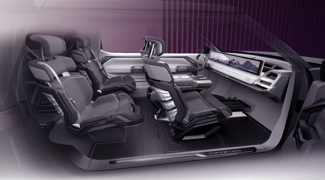 這款GST概念皮卡搭載了眾多新配置,全面顛覆傳統(tǒng)皮卡“工具車屬性”,為用戶帶來個性化的新時代皮卡出行體驗(yàn)。外觀方面,GST概念皮卡采用“新電氣化機(jī)甲”設(shè)計(jì)美學(xué)設(shè)計(jì),硬朗的線條,基本幾何體的切削穿插,展現(xiàn)出一種強(qiáng)烈的力量感和科技感。而在內(nèi)飾設(shè)計(jì)上,GST概念皮卡的美學(xué)靈感源自于宇宙空間站,打造了一個符合“包豪斯BAUHAUS”實(shí)用主義的場景布局:無B柱對開門、電動踏步、4座布局,為用戶帶來更加自由的進(jìn)出方式;副駕座椅既可向外旋轉(zhuǎn)45°開啟迎賓模式,又可向后旋轉(zhuǎn)180°秒變高級卡座,為用戶帶來更多便捷和舒適的使用體驗(yàn)。