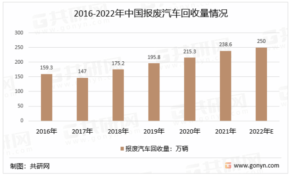 據(jù)數(shù)據(jù)統(tǒng)計,2020年我國報廢機(jī)動車回收數(shù)量215.3萬輛,2021年我國報廢汽車回收量約為238.6萬輛,而2022年也預(yù)計僅為250萬輛,雖同比增長4.78%,但實際回收數(shù)量僅為2022年全國機(jī)動車3.19億輛保有量的0.78%,距離美日德汽車拆解率5.6%、7.2%、6.9%存在明顯差距。