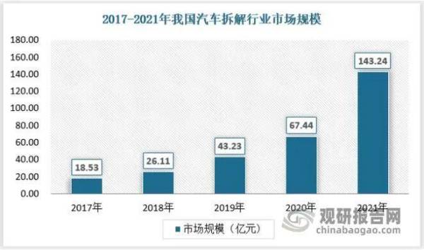 據(jù)觀研報告網(wǎng)《中國汽車拆解行業(yè)發(fā)展趨勢分析與投資前景研究報告(2022-2029年)統(tǒng)計,我國汽車拆解行業(yè)市場規(guī)模不斷擴(kuò)大,汽車拆解數(shù)量由2017年的132.37萬輛增至2021年的462.06萬輛,復(fù)合年化增長率達(dá)到36.69%;汽車拆解行業(yè)市場規(guī)模從2017年18.53億元快速增長至2021年143.24億元,年均復(fù)合增長率為66.74%,保持較快增長態(tài)勢。