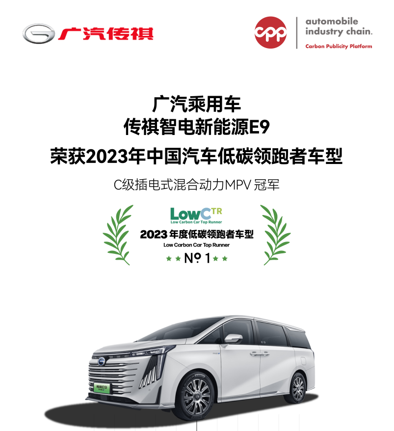 6月19日,由中汽碳(北京)數(shù)字技術(shù)有限公司舉辦的“2023年汽車工業(yè)節(jié)能與綠色發(fā)展評價(jià)中心年度成果分享會(huì)”在北京成功召開,并基于CPP平臺(tái)公布了首批近1400款車型碳足跡數(shù)據(jù),其中,傳祺智電新能源E9,以同級(jí)最低、且低于行業(yè)平均水平16.9%碳排放水平,榮膺“C級(jí)插電式混合動(dòng)力MPV冠軍”,榮獲“2023中國汽車低碳領(lǐng) 跑者車型”。