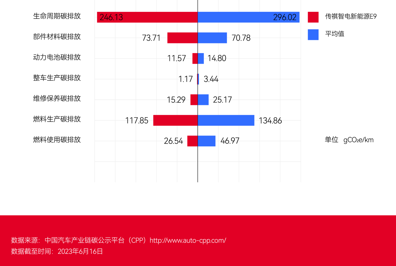 以“C級(jí)插電式混合動(dòng)力MPV”級(jí)別為例,在3個(gè)車系共11款不同銷售型號(hào)車型中,傳祺智電新能源E9在電池、電機(jī)、電控領(lǐng)域優(yōu)勢突出,具有核心專利的機(jī)電耦合系統(tǒng)、彈匣電池和智能能量管理系統(tǒng),整車碳足跡為246.13克二氧化碳當(dāng)量每千米(gCO2e/km),行業(yè)均值為296.02克二氧化碳當(dāng)量每千米(gCO2e/km),比行業(yè)均值低16.9%。