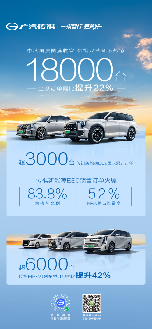 值得?提的是,今年中秋和國慶期間,廣汽傳祺全系訂單超 1.8萬輛,同比提升 22%;而傳祺 MPV 家族訂單超6000輛,同比提升 42%。傳祺在MPV市場的銷冠地位,早已堅如磐石,不可撼動。