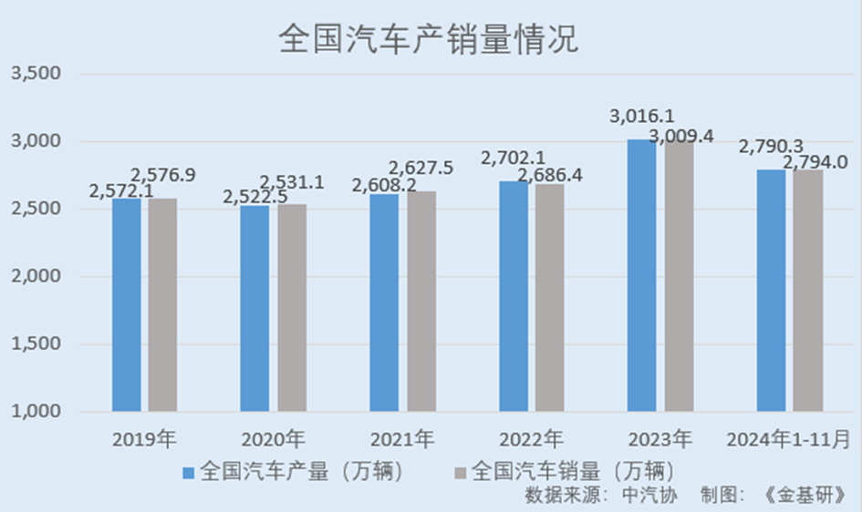 據中汽協數據,2019-2023年,全國汽車產量分別為2,572.1萬輛、2,522.5萬輛、2,608.2萬輛、2,702.1萬輛、3,016.1萬輛;銷量分別為2,576.9萬輛、2,531.1萬輛、2,627.5萬輛、2,686.4萬輛、3,009.4萬輛。2024年1-11月,全國汽車產銷分別完成2,790.3萬輛、2,794萬輛,同比分別增長2.9%、3.7%。