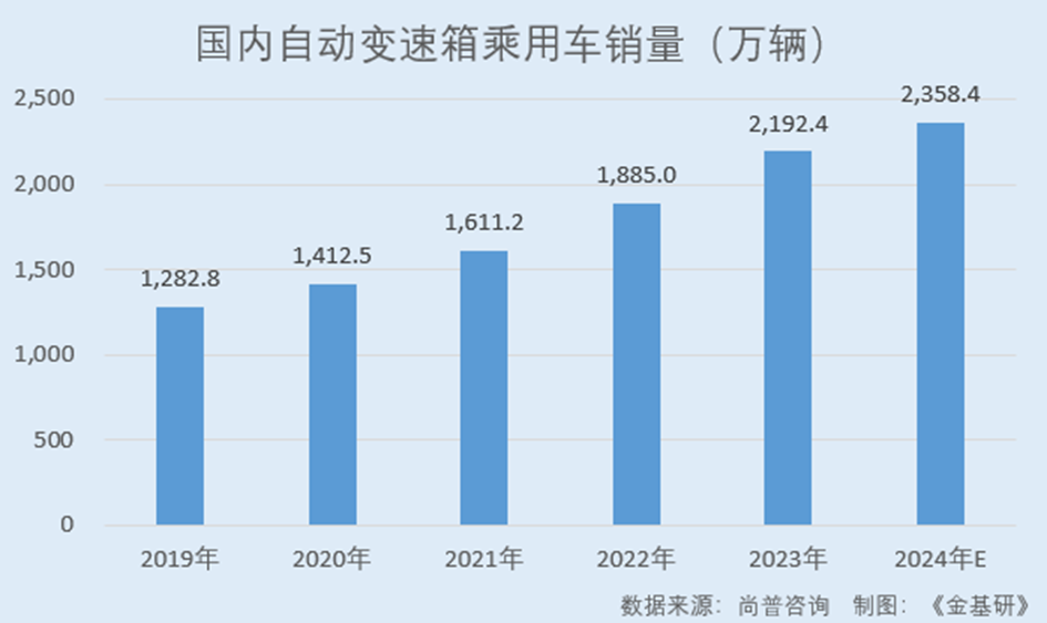 據尚普咨詢數據,2019-2023年,國內自動變速箱乘用車銷量分別為1,282.8萬輛、1,412.5萬輛、1,611.2萬輛、1,885.0萬輛、2,192.4萬輛;國內乘用車市場自動變速箱搭載率分別為62%、70%、75%、80%、85%。尚普咨詢預計2024年國內自動變速箱乘用車銷量將達2,358.4萬輛,乘用車市場自動變速箱搭載率達88%。