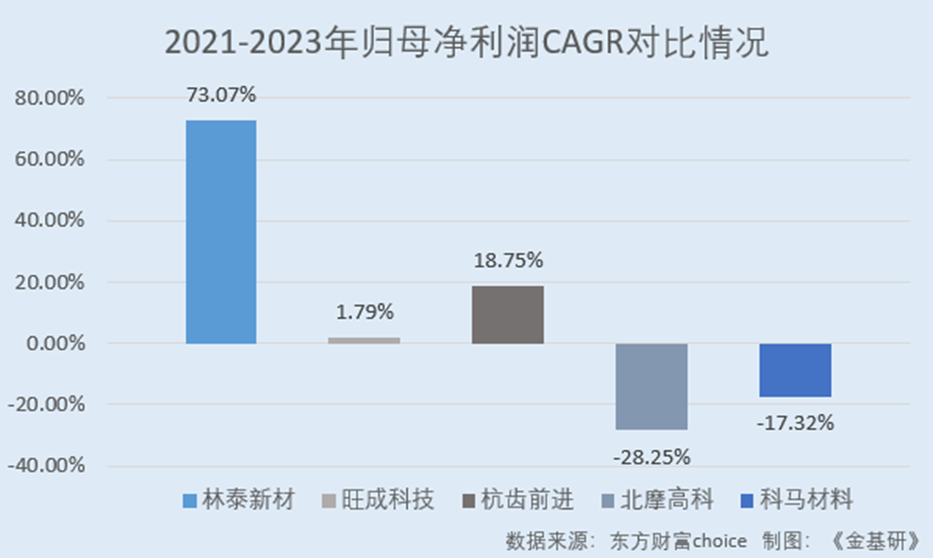 據東方財富choice數據,2021-2023年,林泰新材同行業(yè)可比公司重慶市旺成科技股份有限公司(以下簡稱“旺成科技”)、杭州前進齒輪箱集團股份有限公司(以下簡稱“杭齒前進”)、北京北摩高科摩擦材料股份有限公司(以下簡稱“北摩高科”)、浙江科馬摩擦材料股份有限公司(以下簡稱“科馬材料”)的營收CAGR分別為-2.99%、-6.21%、-8.21%、-5.49%;歸母凈利潤CAGR分別為1.79%、18.75%、-28.25%、-17.32%。