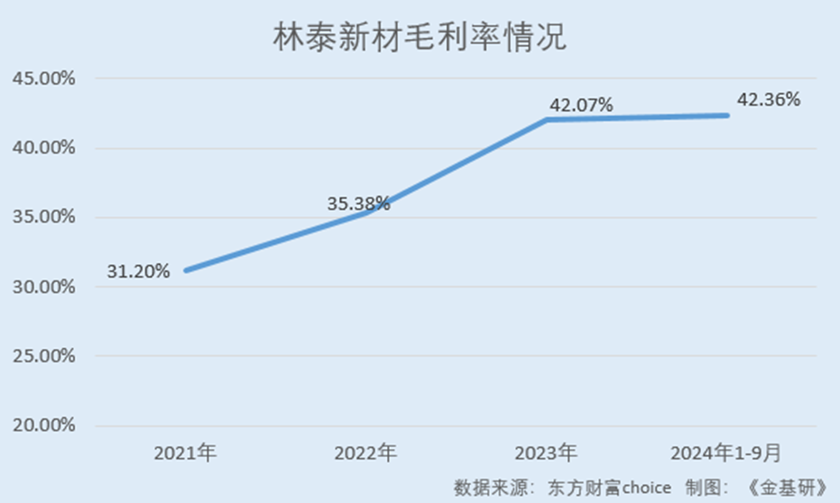 據東方財富choice數據,2021-2023年及2024年1-9月,林泰新材的毛利率分別為31.20%、35.38%、42.07%、42.36%。