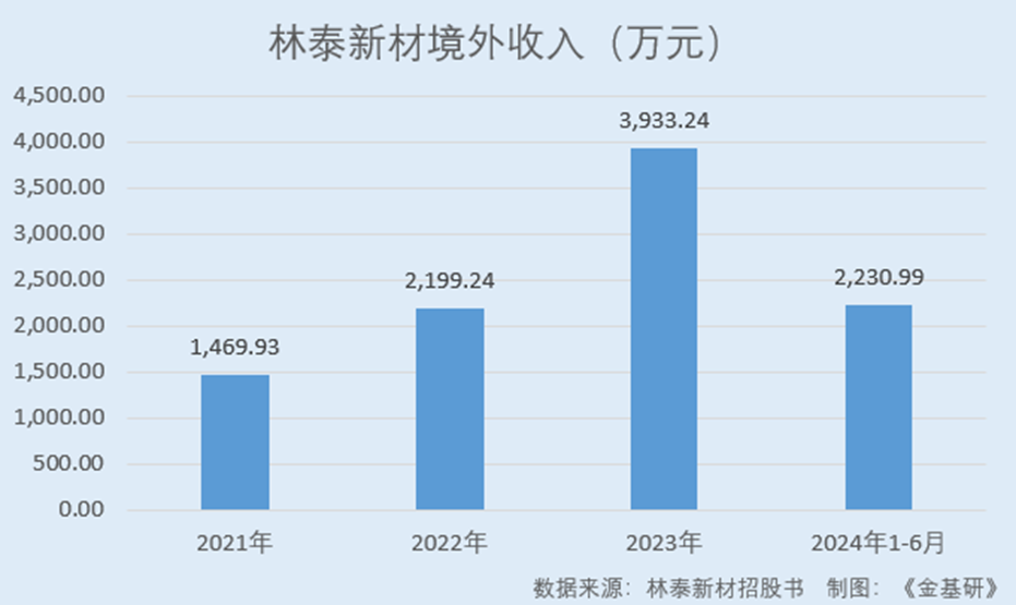 據招股書,2021-2023年及2024年1-6月,林泰新材境外客戶數量分別為56家、79家、134家、109家,境外收入分別為1,469.93萬元、2,199.24萬元、3,933.24萬元、2,230.99萬元。