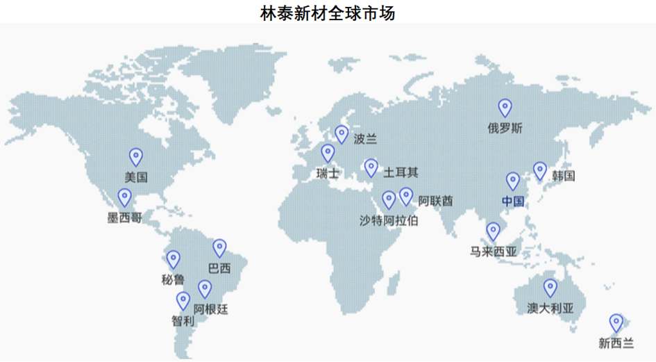 近年來,林泰新材響應國家“一帶一路”倡議,加了對俄羅斯及中亞、拉丁美洲、中東等“一帶一路”地區(qū)的市場開拓力度。在原有境外老客戶銷售額增長的同時,林泰新材亦持續(xù)開拓新客戶,其外銷收入逐年增長。