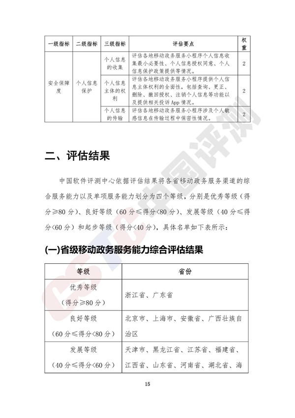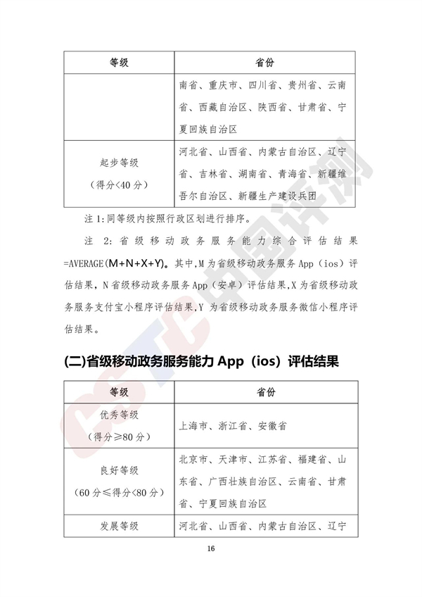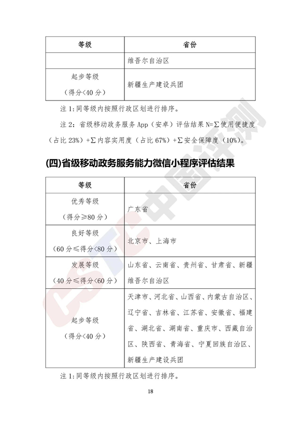 報告將各省移動政務(wù)服務(wù)渠道的綜合服務(wù)能力以及單項服務(wù)能力劃分為四個等級,分別是優(yōu)秀等級(得分≥80分)、良好等級(60分≤得分<80分)、發(fā)展等級(40分≤得分<60分)和起步等級(得分<40分),具體名單如下表所示: