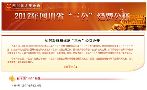 2012年,四川省人民政府網站政務專題欄目圍繞“三公經費”,及時推出“2012年四川省‘三公’經費公開”專題,公開了省政府組成部門、直屬特設機構、直屬機構、部門管理機構、直屬事業(yè)機構共53個省級部門、21個市州的“三公”經費使用情況,以及2011年決算和2012年預算情況