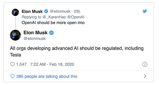 北京時(shí)間2月19日早間消息,特斯拉首席執(zhí)行官埃隆·馬斯克(Elon Musk)周一發(fā)文稱,應(yīng)該對(duì)所有人工智能都進(jìn)行更好的監(jiān)管,即便是對(duì)他的公司也不例外。