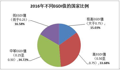 整體調(diào)查結(jié)果來(lái)看,各國(guó)電子政務(wù)水平增長(zhǎng)快速。EGDI值劃分為極高、高、中等和低共4個(gè)類別,具有"高EGDI值"和"極高EGDI值"的國(guó)家數(shù)量在 2016年有所增加。具有極高EGDI值的國(guó)家有29個(gè),大多數(shù)為歐洲國(guó)家(占比66%);具有高EGDI值的國(guó)家為65個(gè),這個(gè)數(shù)據(jù)相較于2014年的調(diào)查有3個(gè)國(guó)家的增加;具有中等EGDI值的國(guó)家數(shù)量為67個(gè);具有低EGDI值的國(guó)家數(shù)量為32個(gè)。