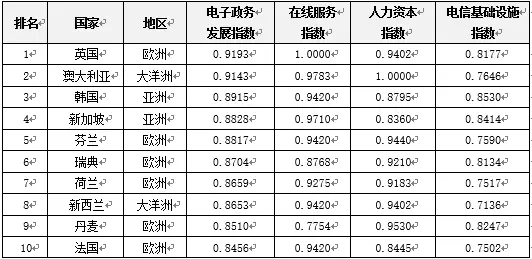 全球電子政務(wù)方面,歐洲繼續(xù)保持領(lǐng)先,2016年全球電子政務(wù)排名中,前10名中歐洲國(guó)家占據(jù)6席。其中英國(guó)以EGDI值0.9193居于全球第一名,澳大利亞以微弱差距居于第二名(EGDI值為0.9143),韓國(guó)、新加坡、芬蘭等國(guó)家也居于前列。