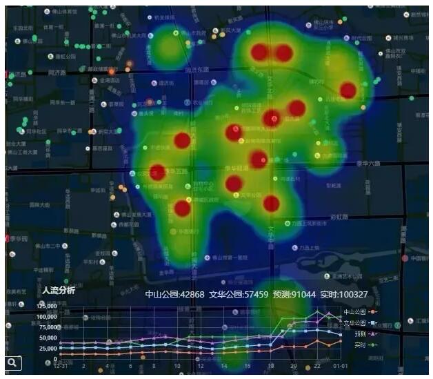 第三是預(yù)判用數(shù)據(jù)說(shuō)話,依托大數(shù)據(jù)分析能力增強(qiáng)工作的針對(duì)性和精確性。佛山有一個(gè)新年倒計(jì)時(shí)活動(dòng),我們跟三大運(yùn)營(yíng)商的手機(jī)實(shí)時(shí)信息對(duì)接,監(jiān)控人流密度,當(dāng)超過(guò)某一個(gè)值的,發(fā)現(xiàn)預(yù)警對(duì)人流進(jìn)行實(shí)時(shí)疏散。下圖是演示疏散情況,紅色的點(diǎn)是新年倒計(jì)時(shí)活動(dòng)人流量最多的區(qū)域,我們?cè)谌肆髁孔疃嗟牡胤阶隽艘粋€(gè)疏散的區(qū)域,及時(shí)進(jìn)行疏散。