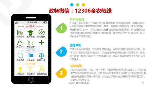 首先介紹12306金農(nóng)熱線,它整個(gè)應(yīng)用的功能不止這三個(gè),它的功能有幾十個(gè)入口,但是里面就有這么幾個(gè)入口。第一個(gè)是他們通過(guò)APP推了一個(gè)欄目,這個(gè)欄目是《阿文有話說(shuō)》,通過(guò)這個(gè)欄目就可以進(jìn)行融資,防范受騙,相當(dāng)于是把信息轉(zhuǎn)化成了精品內(nèi)容。第二個(gè)是基于農(nóng)民老是會(huì)買(mǎi)到假種子,用戶關(guān)注度比較高的區(qū)域他設(shè)立了一個(gè)舉報(bào)的途徑。第三個(gè)是價(jià)格查詢,每天包括水稻、肉類的價(jià)格可以實(shí)時(shí)查詢到。
