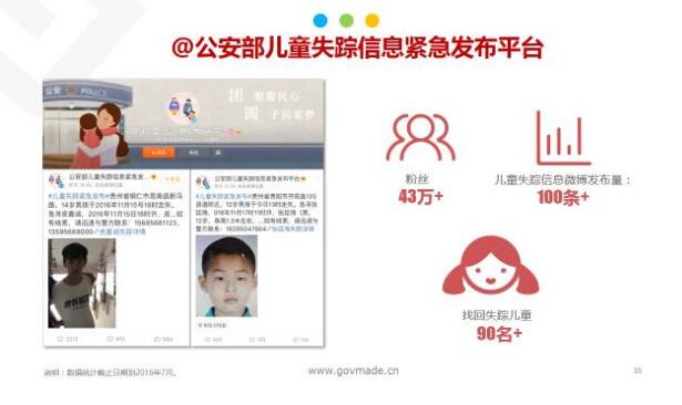 公安部?jī)和й櫺畔⒕o急發(fā)布平臺(tái),現(xiàn)在有了43萬(wàn)的粉絲量,其實(shí)這個(gè)平臺(tái)非常簡(jiǎn)單,但是它抓住了現(xiàn)在整個(gè)社會(huì)的痛點(diǎn),很多人孩子丟失了,雖然通過(guò)這個(gè)平臺(tái)才找到了90個(gè)兒童,但這90個(gè)兒童給大家更多的是一種希望,如果將來(lái)能把這個(gè)平臺(tái)真正的運(yùn)用起來(lái)讓更多人關(guān)注,我們將來(lái)找到的人不只是這90個(gè)兒童。