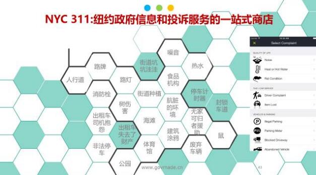 國(guó)外的案例包括紐約的政府信息和投訴服務(wù)的一站式商店,不管是老鼠太多了,還是下水道里面有噪音,都可以給你提供一個(gè)入口和分類,大家就根據(jù)你的入口提供一些建議和投訴統(tǒng)一給他進(jìn)行反饋。