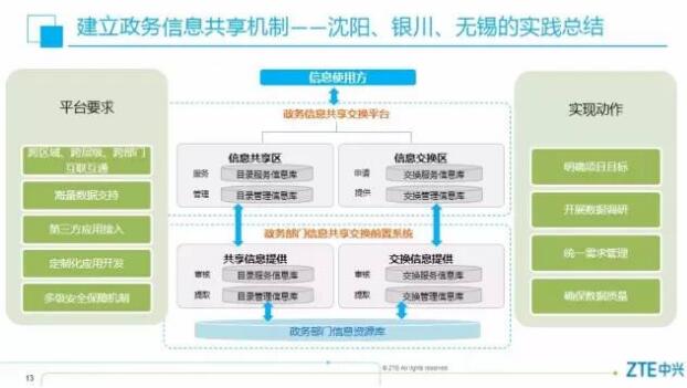 關(guān)于信息共享,從沈陽、銀川、無錫各地的實(shí)踐中可以總結(jié)出,首先就要建立政務(wù)信息共享機(jī)制。先要建立政務(wù)信息共享交換平臺(tái),以信息共享交換平臺(tái)為中心,上面為信息資源庫,下面為共享開放,當(dāng)然對(duì)平臺(tái)也有一些要求,如跨區(qū)域、跨層級(jí)、跨部門的互聯(lián)互通,海量數(shù)據(jù)支持,第三方應(yīng)用接入,定制化應(yīng)用開發(fā)以及多級(jí)安全保障機(jī)制等;另外一部分內(nèi)容就是實(shí)現(xiàn)動(dòng)作,也就是實(shí)施過程當(dāng)中需要明確的內(nèi)容,包括明確項(xiàng)目目標(biāo)、開展數(shù)據(jù)調(diào)研、統(tǒng)一需求管理、確保數(shù)據(jù)質(zhì)量等(見下圖)。